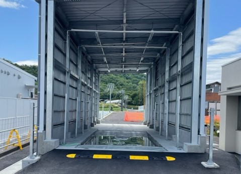センサーを出入り口に設置し、噴射のON-OFFを正確に行うようにしました。車両全体に消毒液噴射する為に門型+下部噴射を設置しています。また、タイヤ部は水槽を併用する事で、病原菌を遮断します。